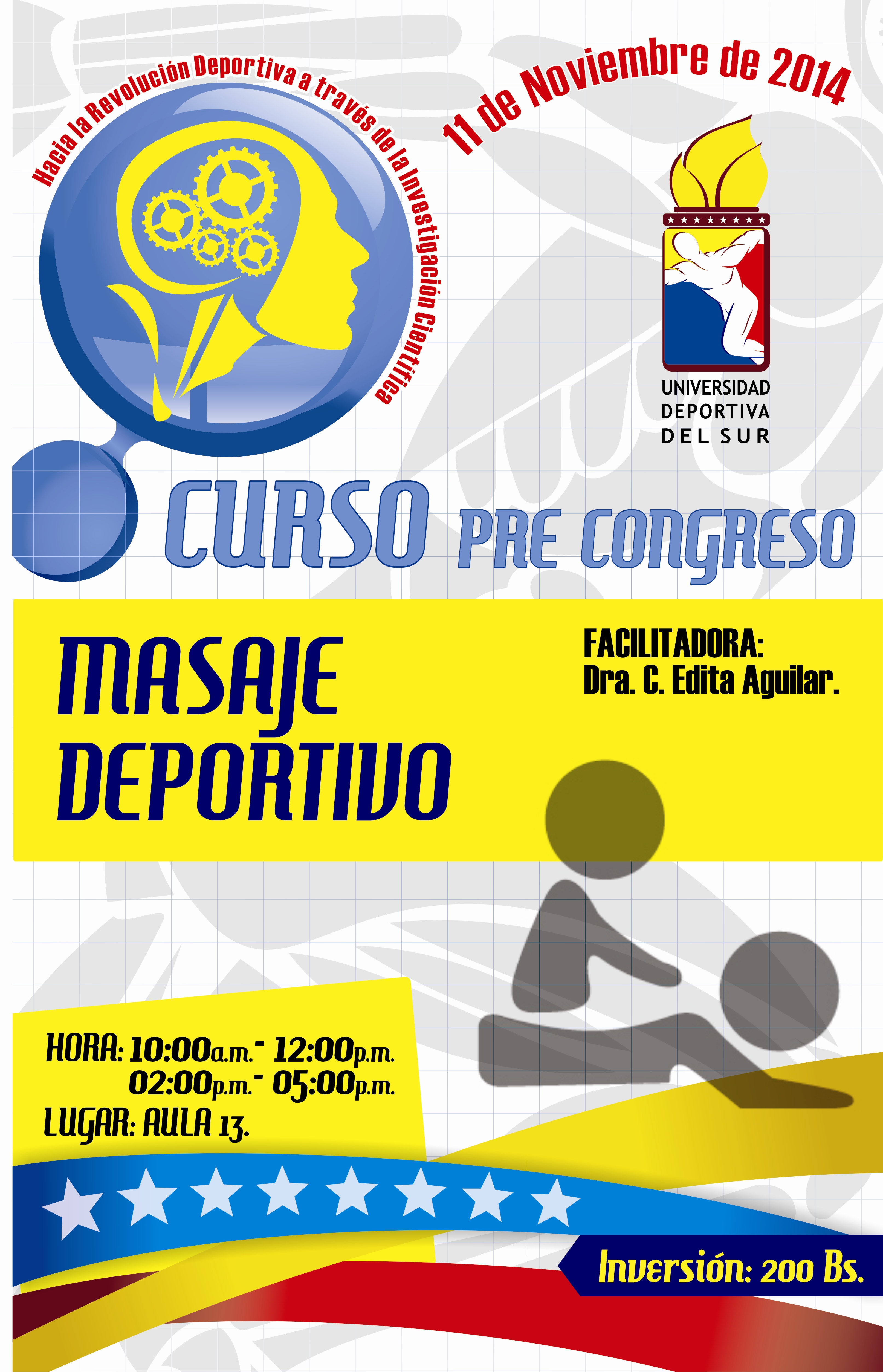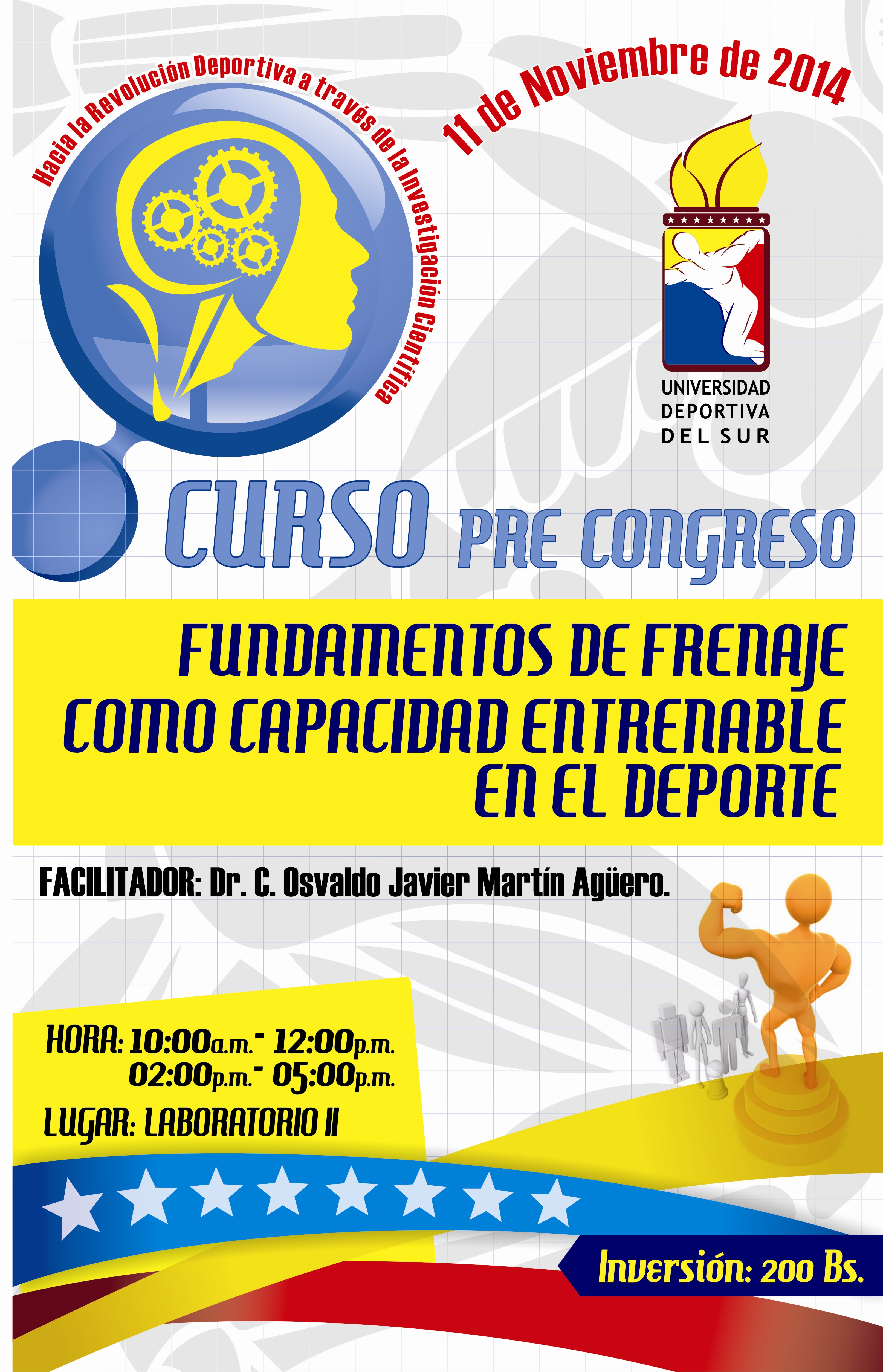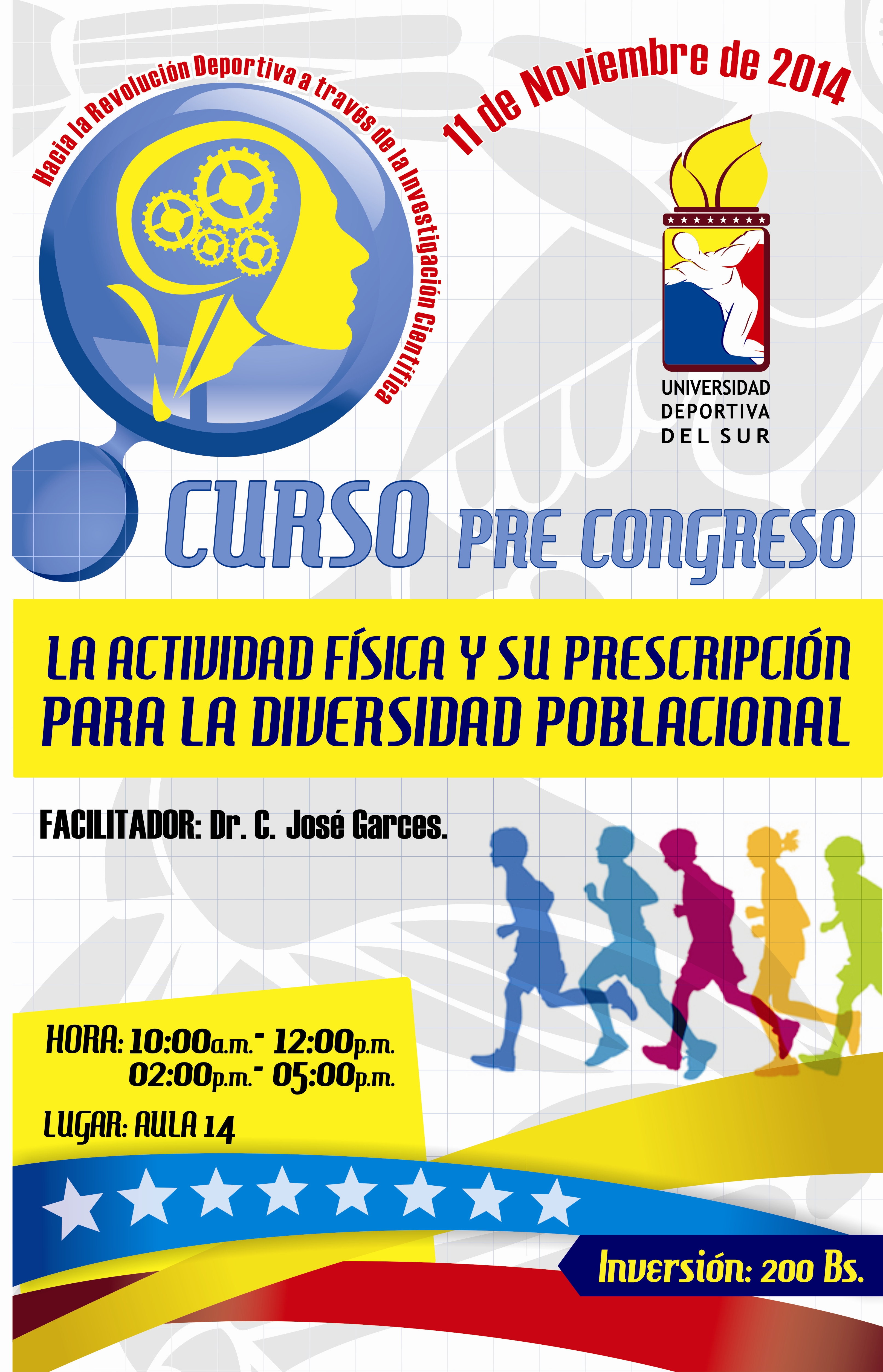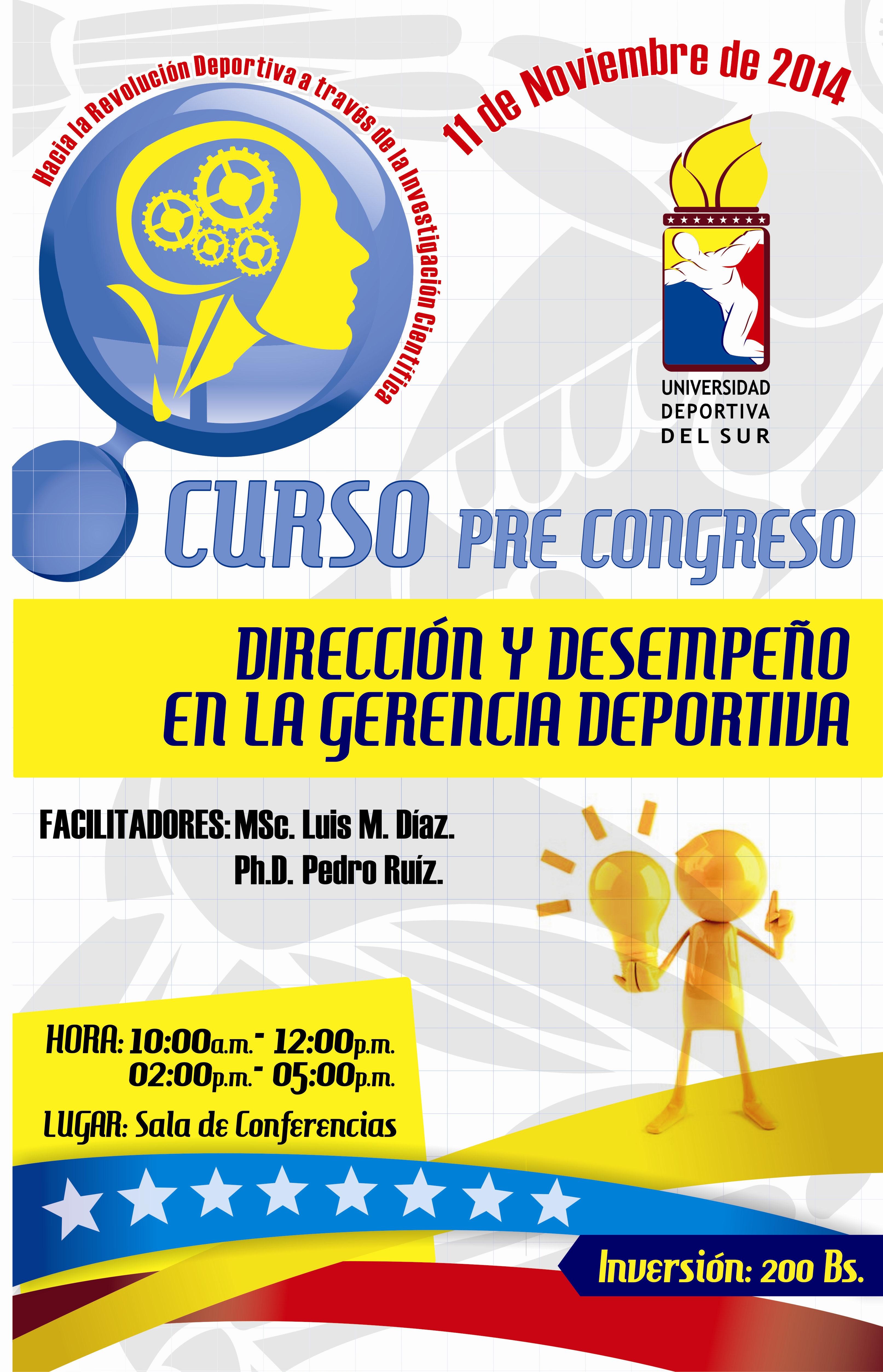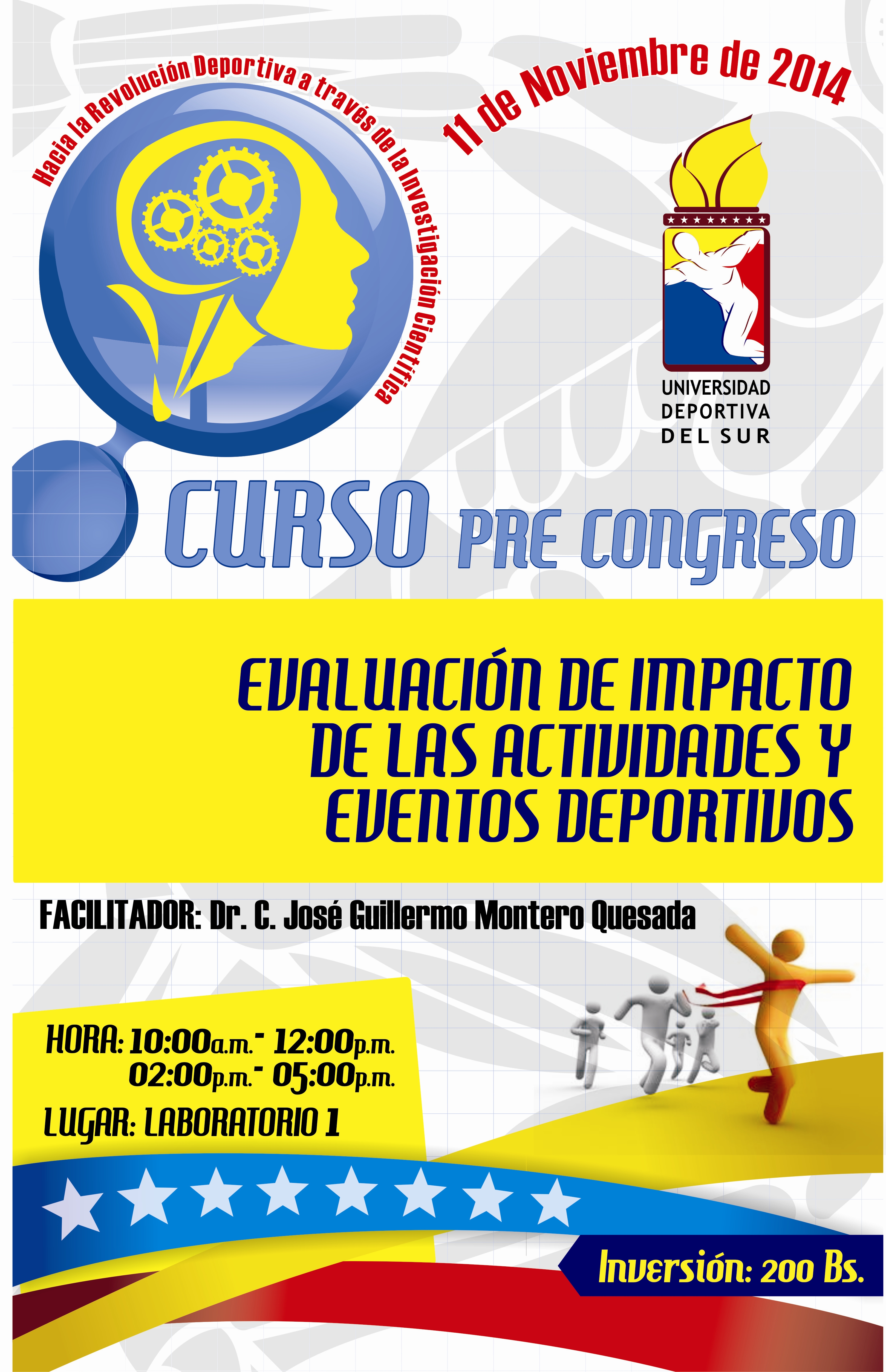 El curso pre congreso tendrá limitado el cupo, solo podrá optar uno por participante, quien desee hacerlo debe cancelar en efectivo dicho curso el día 11 de Noviembre de 2014. En horario único de 8:00 a.m. a 9:00 a.m. se agradece puntualidad.